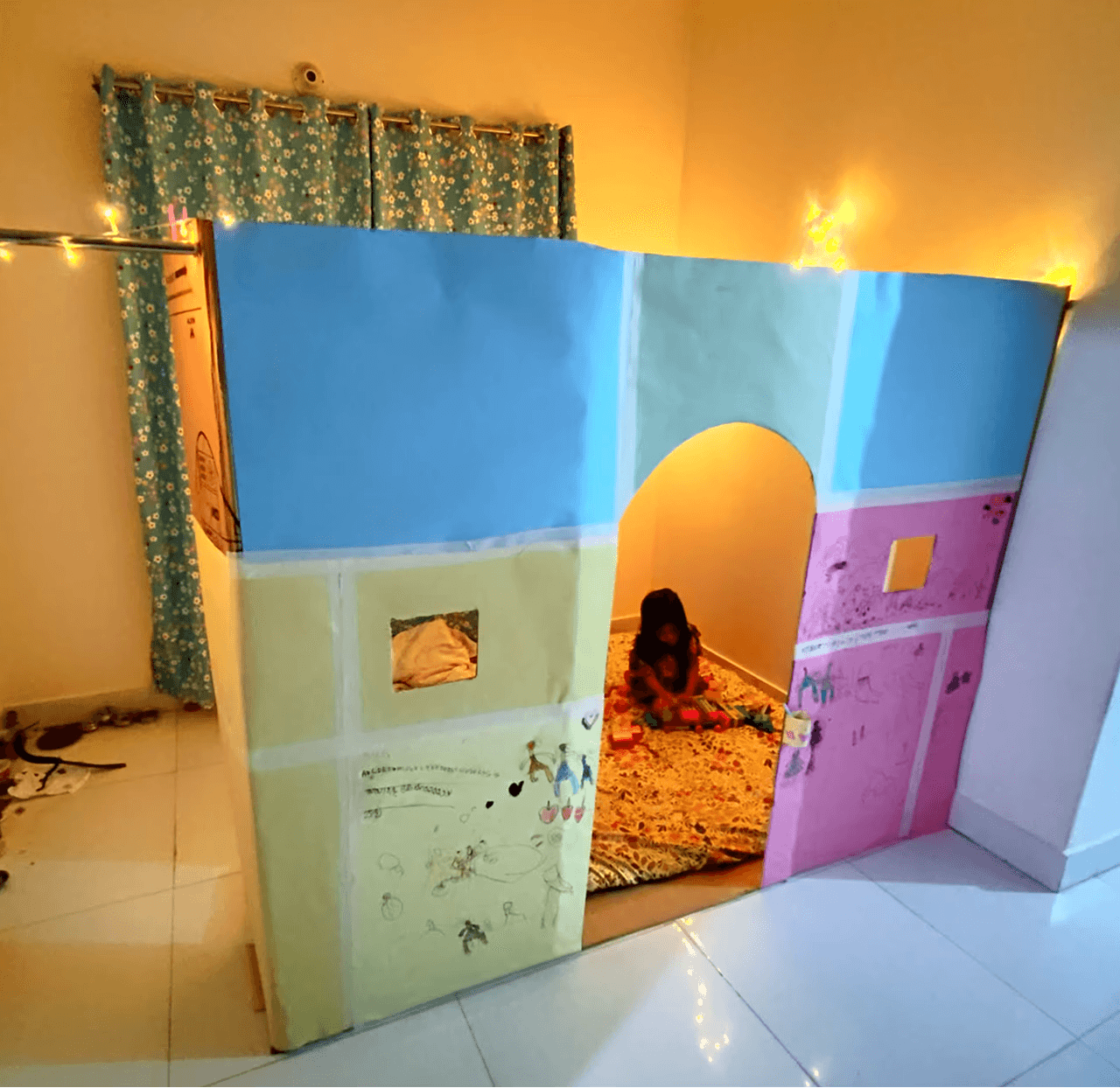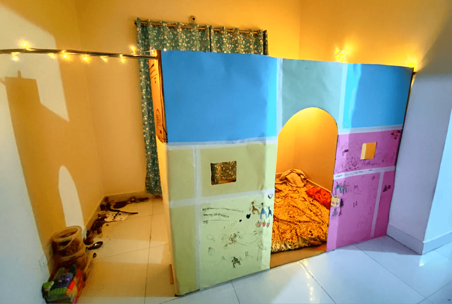 Designed and built a cozy cardboard playhouse for my 4-year-old using recycled materials, paired with a smart routine system and future IoT planning.
