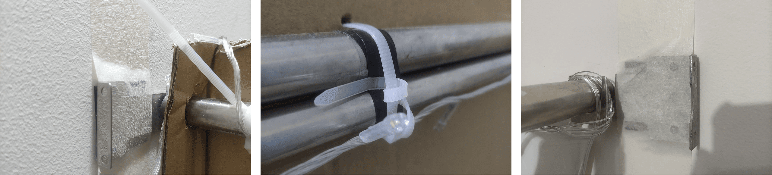 My biggest concern was how to make the cardboard stand upright securely without drilling into the walls. I had used double-sided tape on a previous project and the structure collapsed, so I was hesitant. After some ideation, I tried the tape method again but from a different angle. I attached two clamps directly to the wall using heavy double-sided tape and reinforced them with paper tape. It worked perfectly! I then used cable ties to secure the cardboard firmly to the support pipe.