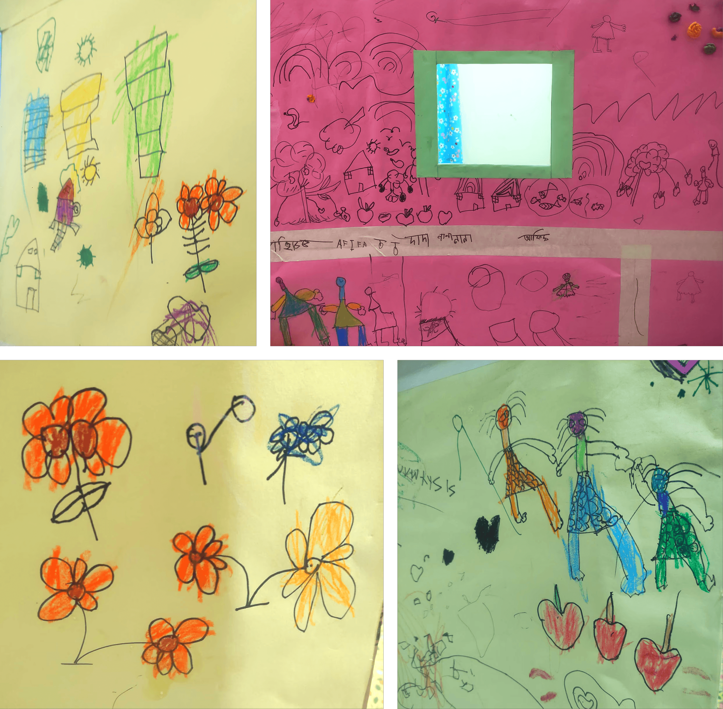Honestly, a giant raw cardboard box sitting in the drawing room looked pretty ugly. I started planning how to color it and decided to test gluing large art paper onto the surface. I bought two sheets from a local stationery shop for 40 Taka to run a trial. It looked great, and then the real "aha!" moment hit me: this art paper naturally turned the wall into a true, open canvas for her. I immediately bought more and covered the whole exterior in different colors.